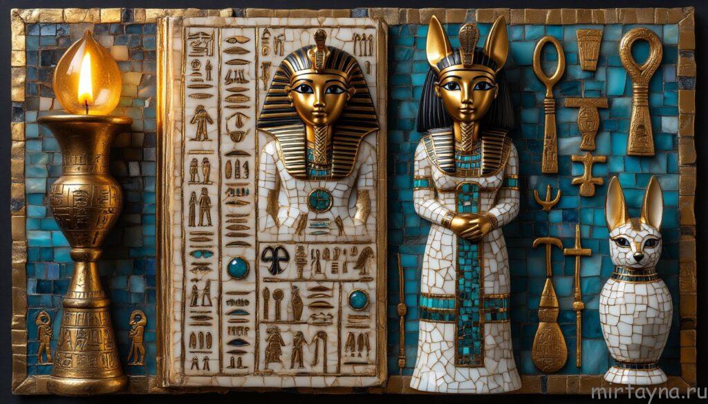 | Амулеты и фигурки | Фаянс, камень, металл | На теле мумии или в нишах гробницы | Размещение в соответствии с текстом | Защита тела и усиление заклинания |