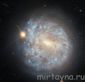 На представленном снимке от космического телескопа «Хаббл» запечатлена прекрасная картина: сверкающая спиральная галактика NGC 4900 с яркой звездой в созвездии Девы. Несмотря на кажущуюся близость и даже частичное перекрытие объектов, на самом деле они находятся на огромном расстоянии друг от друга.
