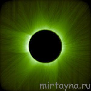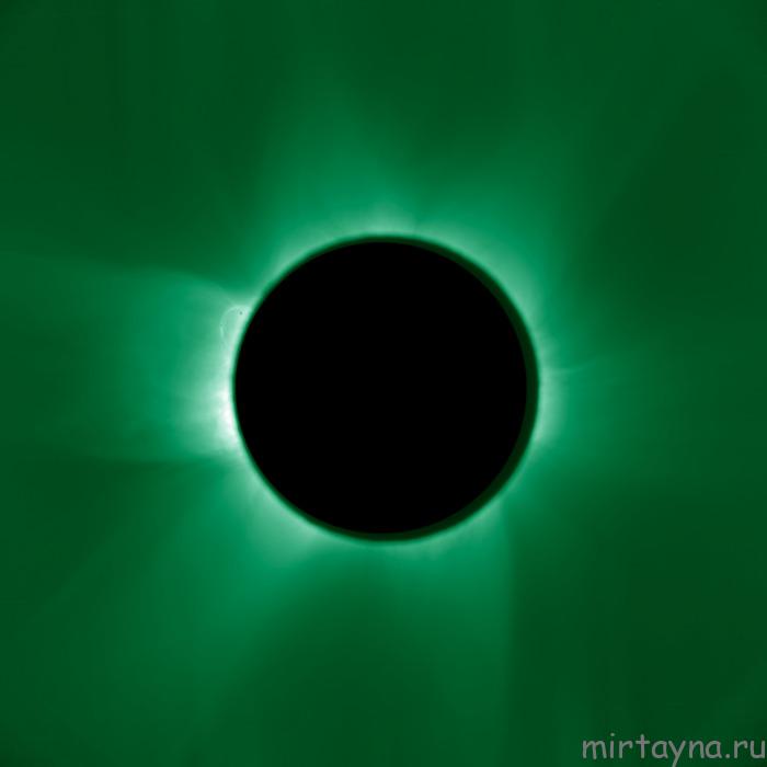 Третье изображение было получено ASPIICS в корональной зеленой линии — спектральной линии, испускаемой атомами железа, которые потеряли половину своих электронов из-за чрезвычайно высоких температур. Это позволяет увидеть вещество короны, нагретое при температуре до 2 млн градусов. В верхней левой части снимка можно увидеть горячую петлю, простирающуюся от поверхности Солнца в корону. Такие структуры обычно появляется после солнечных вспышек. Цвета условные.