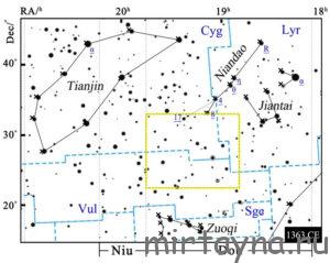 Одно из таких событий — очередная «гостевая звезда» — была зафиксирована в документах династии Мин в октябре 1408 года. «Событие» описали как «неподвижный жёлтый объект, который оставался видимым более 10 дней». Он располагался на фоне Млечного Пути там, где находятся «европейские» созвездия Лебедя и Лисички (Vulpecula). Китайские астрономы предпочитали указывать небесные координаты объектов в отнесении к собственному списку китайских мини-созвездий (астеризмов), дающему более детальную разбивку небесной сферы по сравнению с европейским. В частности, говорится, что звезда находилась к юго-востоку от астеризма под названием Niandao, а также — в лунном «доме» Dou. Из китайской хроники можно вывести его характеристики, которые отвечают вспышке Новой: значительную яркость (от -4 до 0 звёздной величины), устойчивость цвета и стабильную кривую блеска на протяжении длительного времени. Напомним также, что в астрономической терминологии того времени был специальный термин «звезда-гость» (kèxīng 客星), зарезервированный под несколько групп явлений — это может быть как Новая, так и Сверхновая, а также что угодно, что показалось астрономам в меру неподвижным на небесной сфере и достаточно ярким. Сейчас в астрономических обзорах неба для таких объектов до их подробной идентификации также зарезервирован похожий «зонтичный» термин — transients.