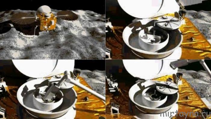 «Тяньвэнь-2» во время сбора образцов грунта, иллюстрация. Увы, лучшего качества найти не удалось. Credit: CNSA/CAST.
